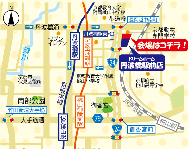 (会場内に駐輪スペースがございます。駐車スペースは会場南隣のドリームホーム丹波橋駅前店前に2台ございます。満車の場合は近隣パーキングへご駐車お願いいたします。)